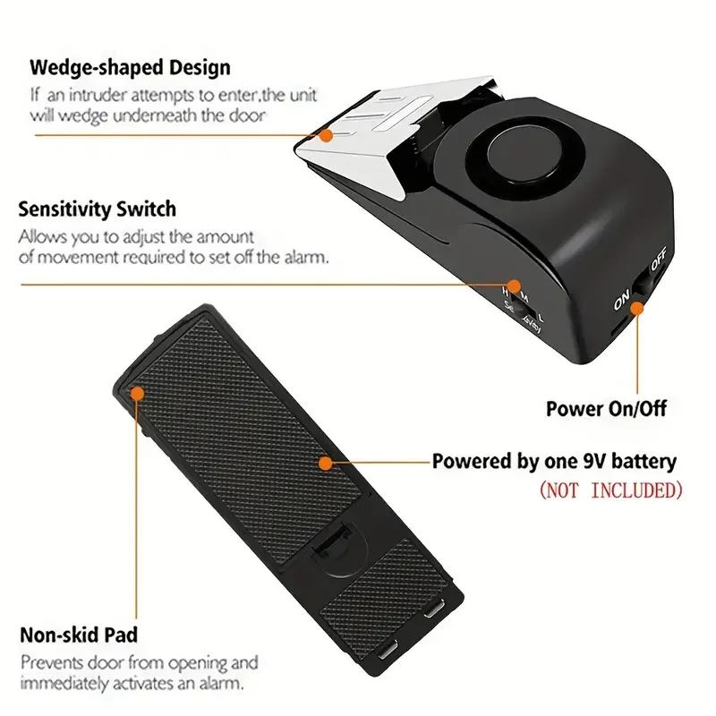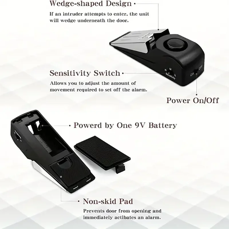 When triggered, this door stop alarm produces a high-pitched 120dB sound to notify you and deter potential intruders. Enhance the security of your home by using this user-friendly door stopper wedge. Just slide it under your door and turn on the alarm for extra reassurance.
